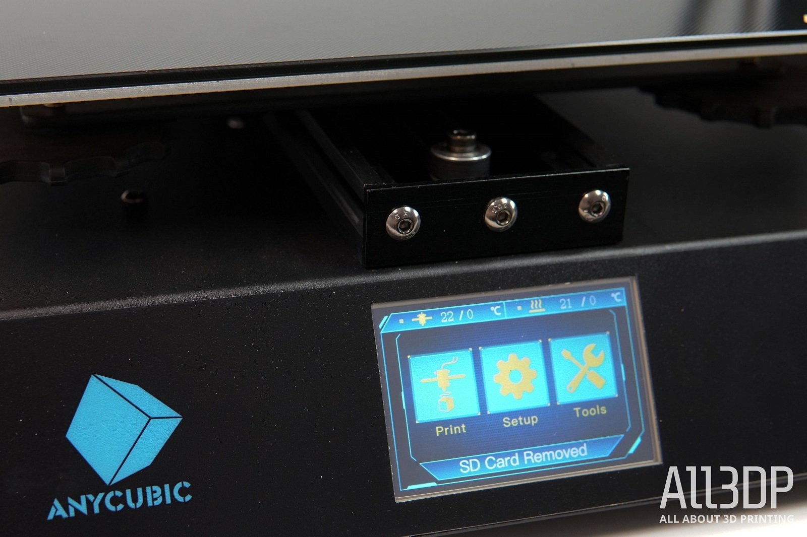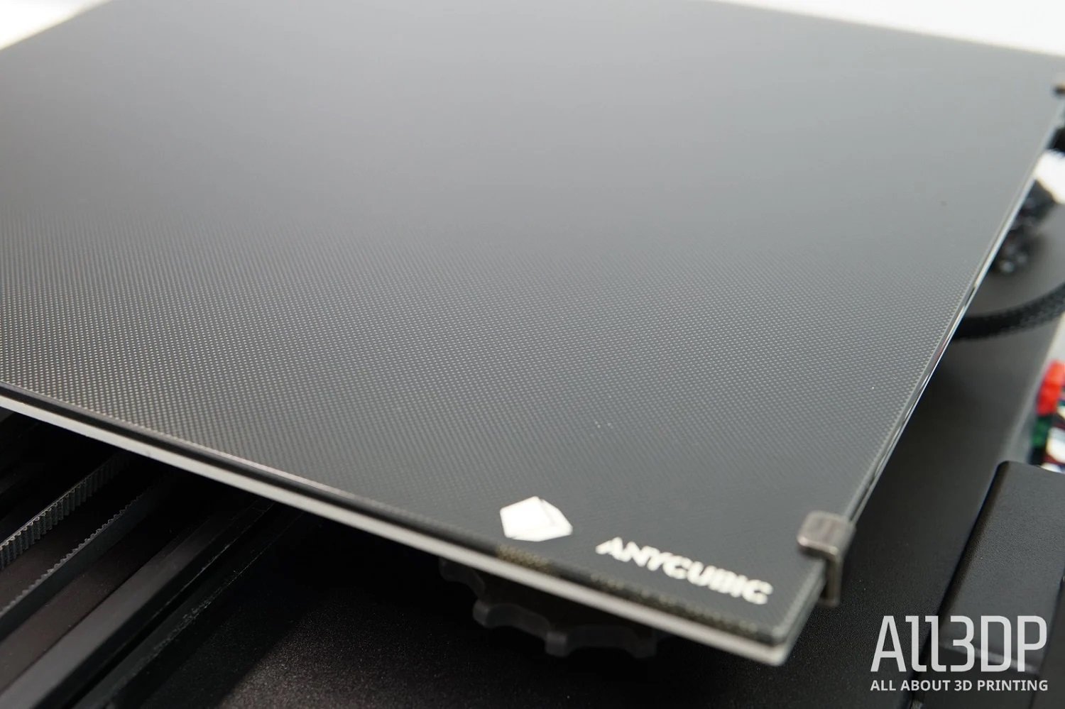 Encompassed by all this sturdiness is the heart of the 3D printer – the roomy, 300 x 300 mm Anycubic Ultrabase print bed, perched atop four spring screws for manual bed leveling.