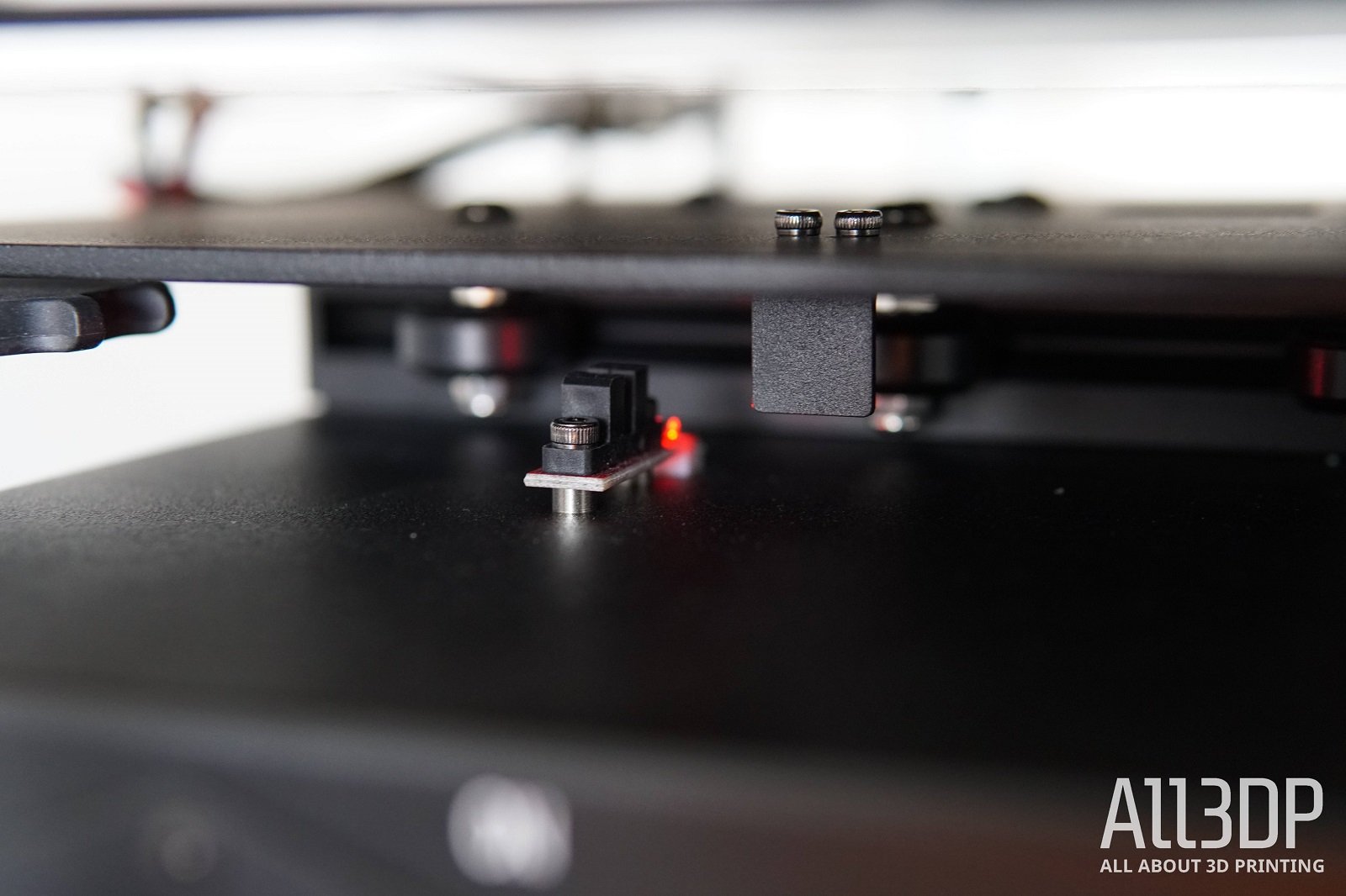 Unlike the mechanical end stops on the X-axis, Anycubic used a contactless sensor for the print bed (Y-axis) end stop. The sensor strikes when the mechanical slider comes close.