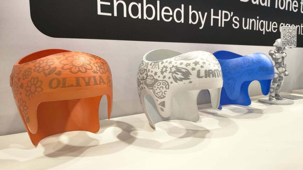 smaller product updates are quietly adding more value for existing users. We got a look at the new "two-tone" MJF process, which allows for different shades on the surface of a monomaterial print. Arriving later this year – initially for the 5600 machine – this free upgrade enables serialization, QR codes, and custom branding via textures or images directly in the print job. Because the finish survives the dyeing process, it opens up a world of flexibility for manufacturers without additional process steps.